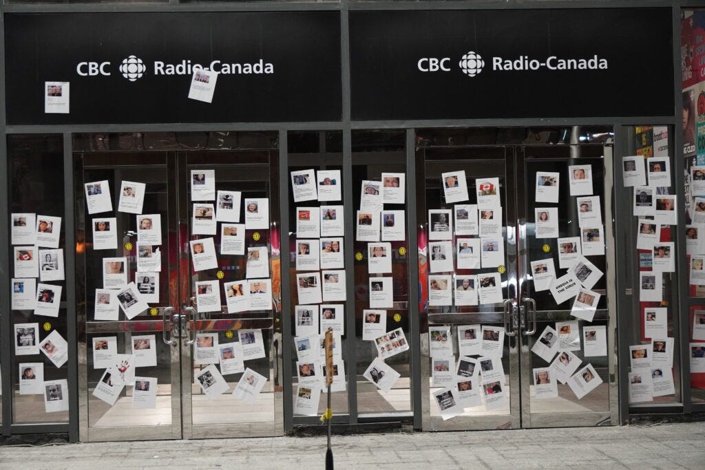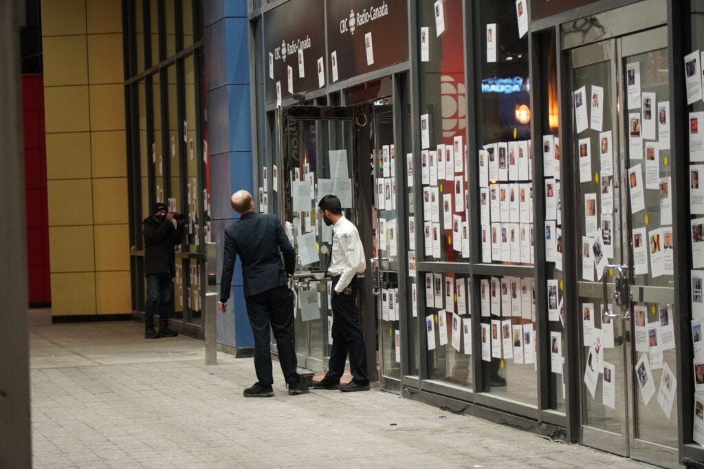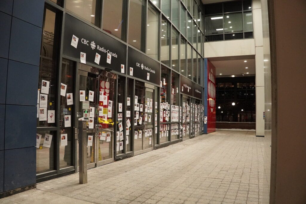 Plastered with profiles of 100s of suspected Covid-19 "vaccine" injuries and deaths this morning, CBC Toronto targeted for their role in promoting, causing and suppressing unprecedented adverse events